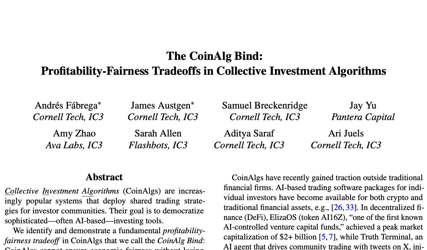 A related discussion explored collective investment algorithms (CoinAlgs) and the trade-offs between profitability, fairness, and transparency. Fully transparent strategies encoded in a smart contract tend to lose profitability over time as other participants learn and arbitrage against them. More private strategies preserve performance, but introduce concerns around fairness and information asymmetry.